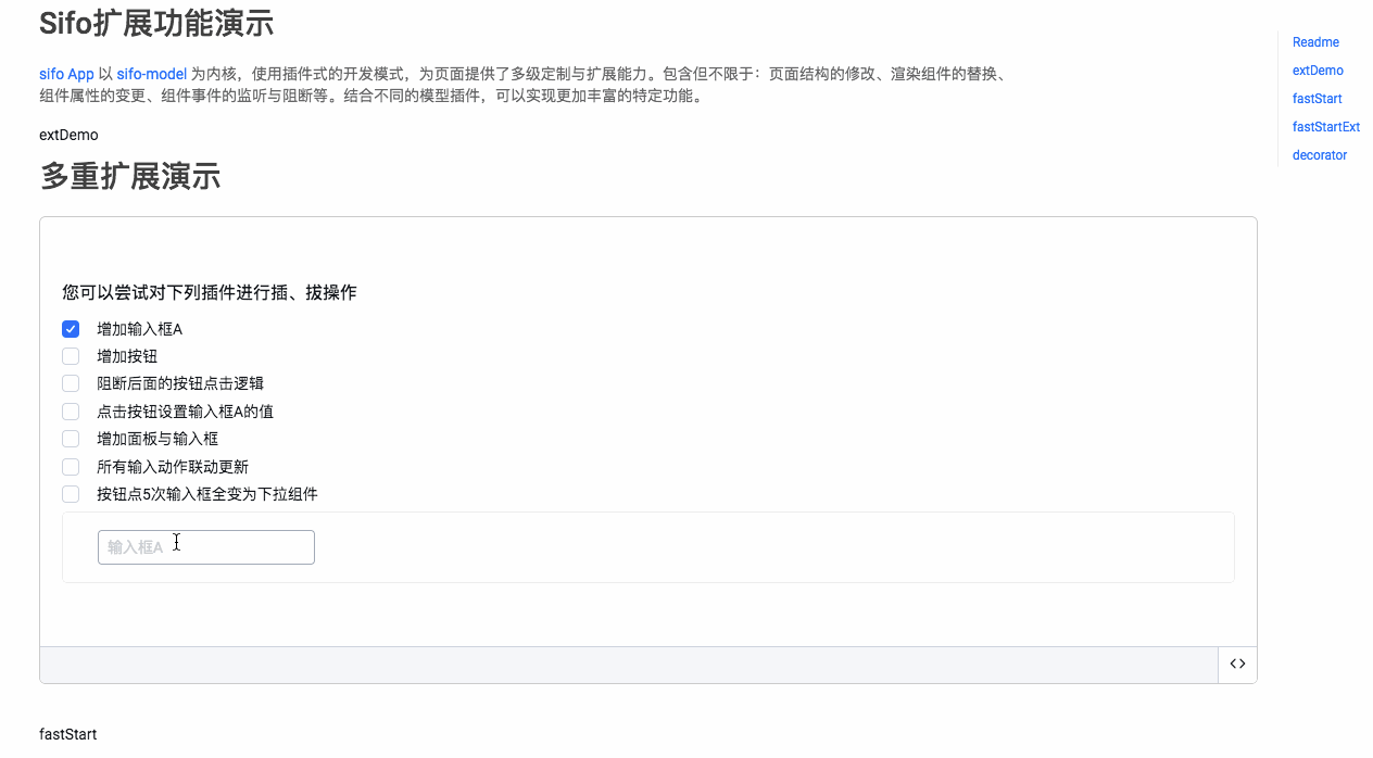 , with which a normal React Commponent will has extension ability. You can learn about that via package's README or online demos. - sifo-vue is a Vue Component encapsulates sifo-model and sifo-singleton. sifo-vue also support